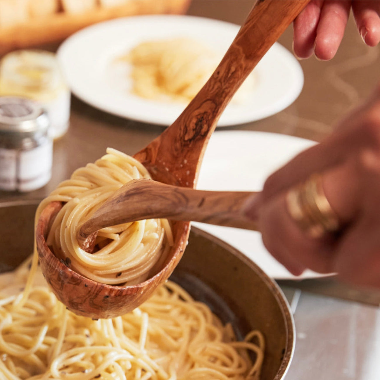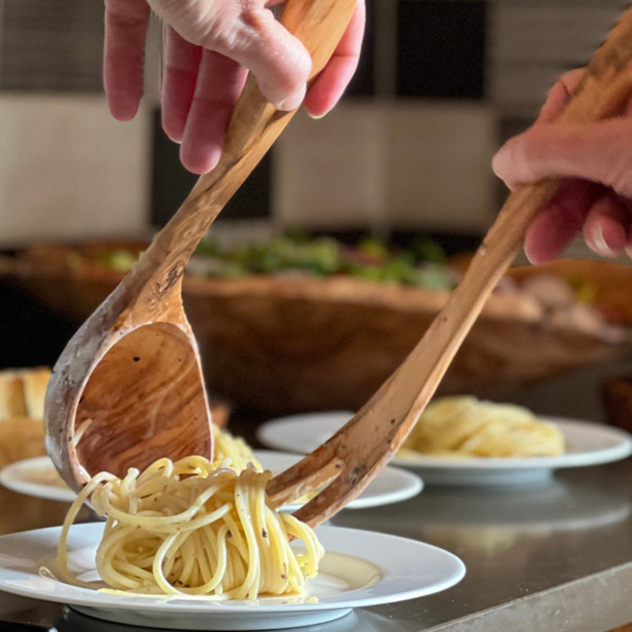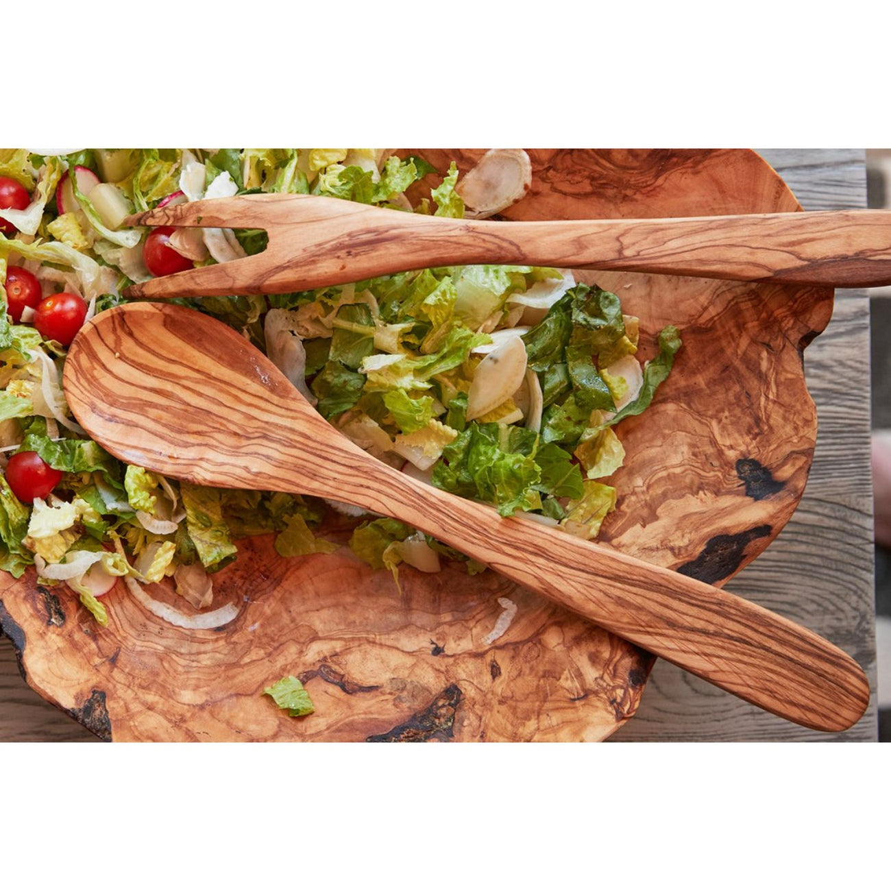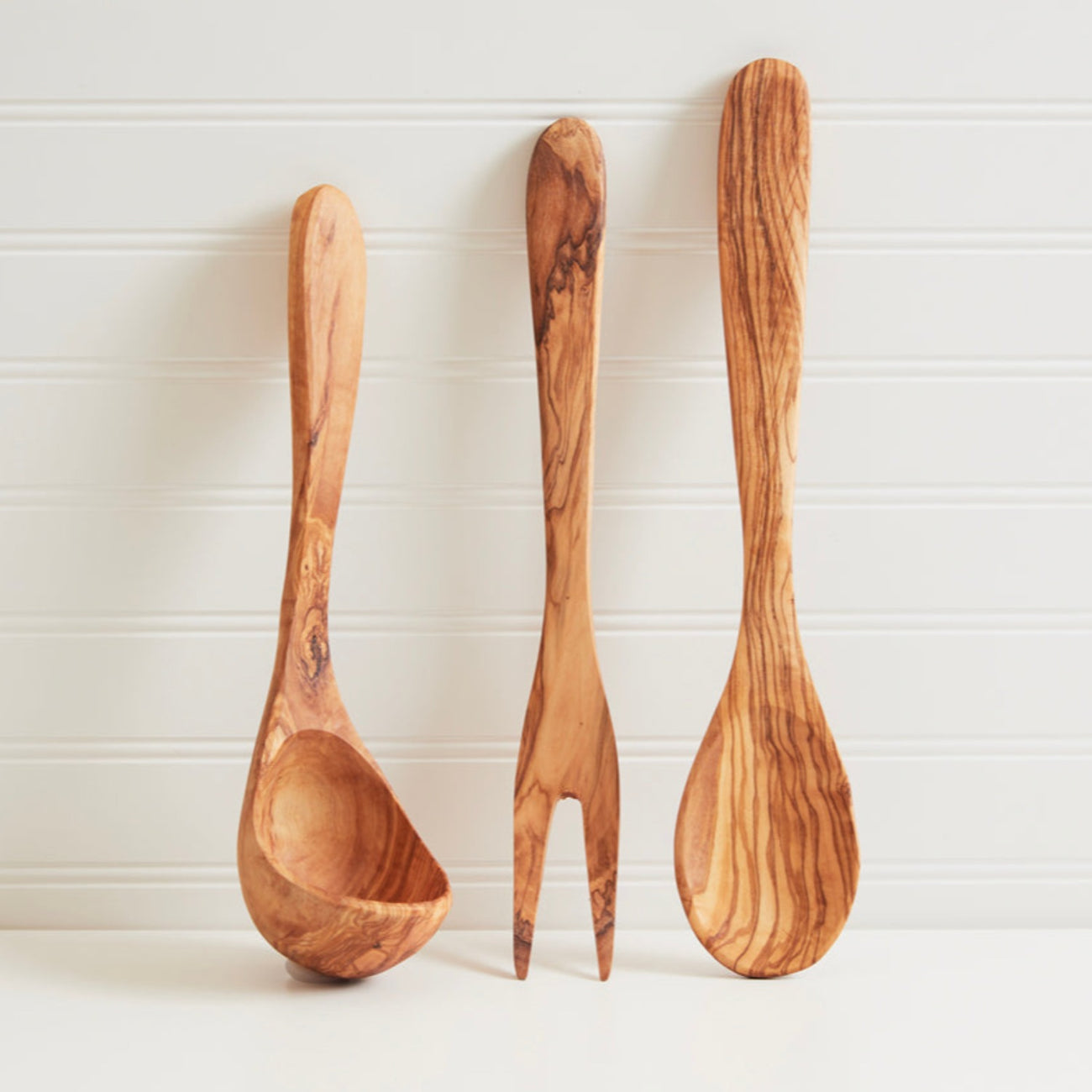 This set of Italian Olivewood Serving Utensils: Soup Ladle, Fork and Spoon are an elegant addition to any kitchen. Beautifully crafted from a single piece of wood, its naturally-occurring grain runs the length of each utensil for a durable, smooth, and silky feel. Not only stylish, but olivewood also offers hard-wearing qualities and anti-bacterial properties, making it ideal for food preparation.